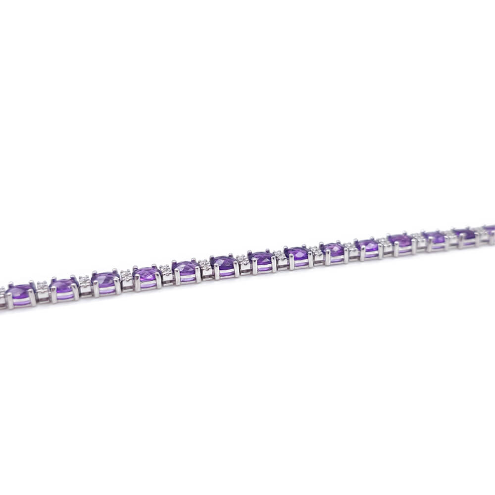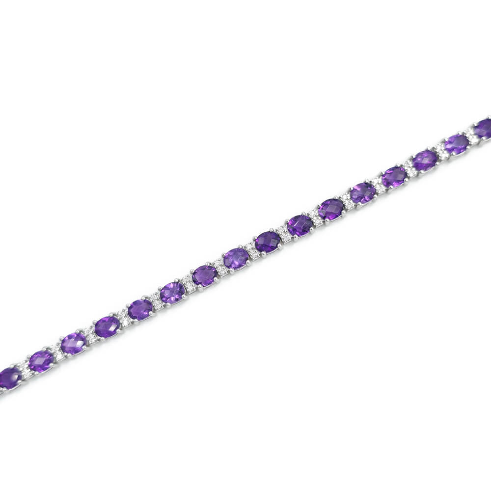 Ladies 18k white gold amethyst and diamond tennis bracelet measuring 6.5" long with a hidden box clasp and dual figure-eight safety. The bracelet is in new condition with a bright polish finish, featuring;