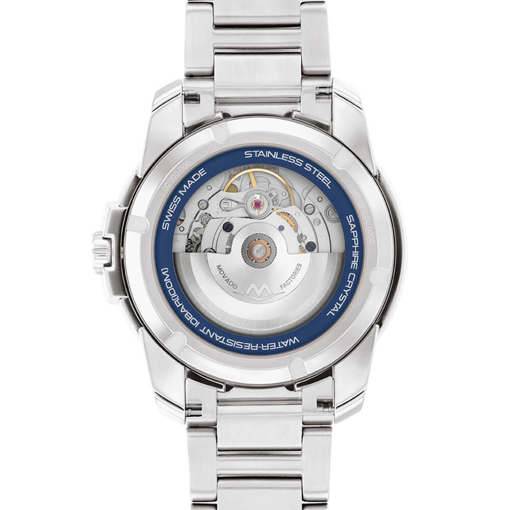This 43mm watch features a blue dial, Swiss Super-LumiNova accents, and Movado's signature dot at 12 o'clock.