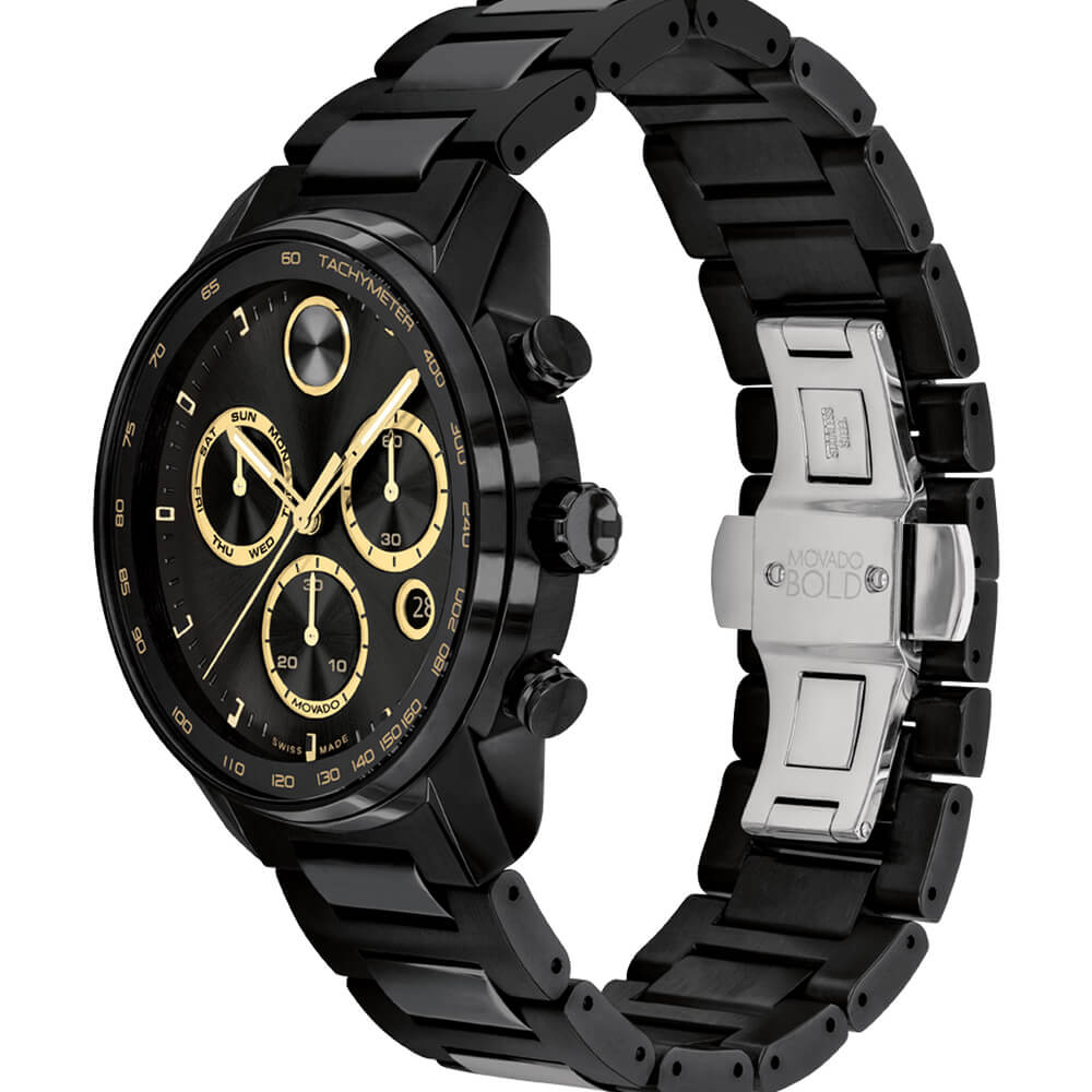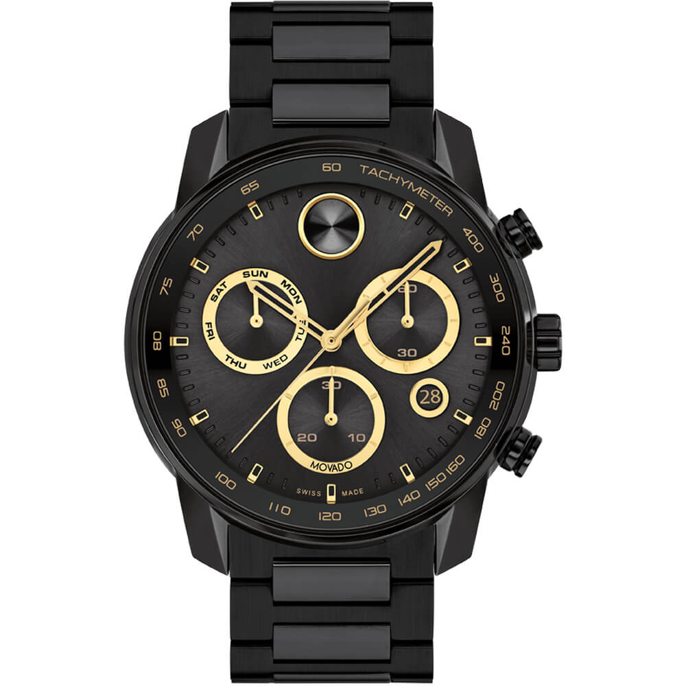 The sporty, eternally stylish chronograph gets fresh feel with strong, contemporary design that combines modern minimalism and a bold edge. The classic bracelet and statement-making 44mm case are cast in rich black ion-plated stainless steel for a flawlessly refined finish. The black chronograph dial features a date window, pale yellow gold toned details, Swiss Super-LumiNova® accents framed by a tachymeter bezel.