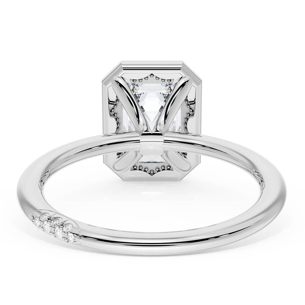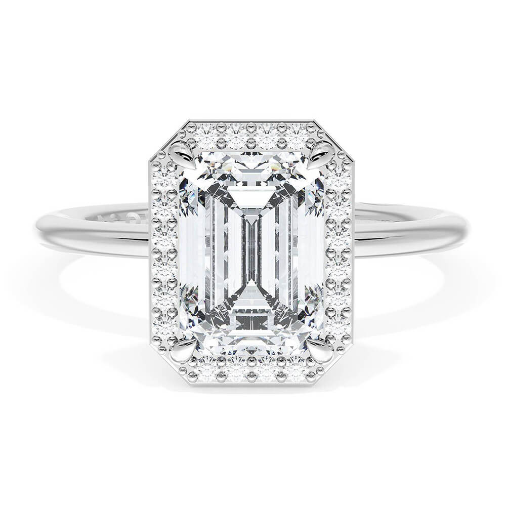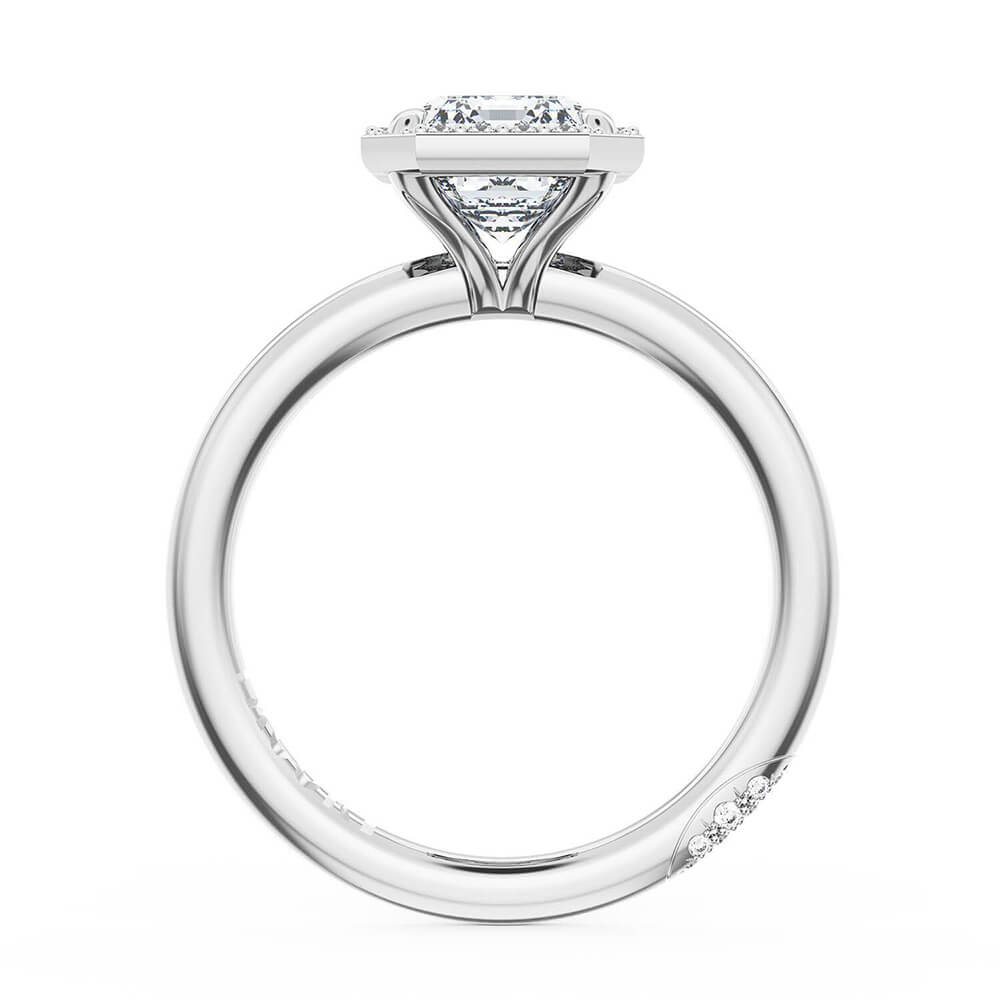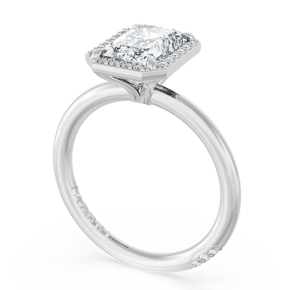An Emerald solitaire is elevated by a modern bloom of round brilliant diamonds, and set into a high-polish Platinum foundation. TACORI Crescents add hidden detail to the underside of the crown.