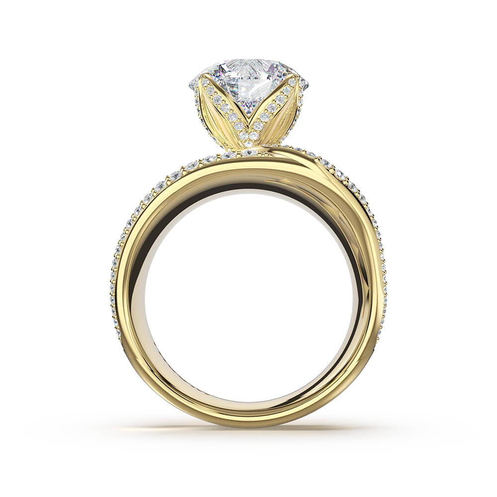 Deconstructed dahlia petals wrap the 18kt yellow gold foundation in pavé-traced texture, rising to elevate and frame a round-cut center stone. Ribboned layers cascade along the band in dimensional texture that shifts with light.