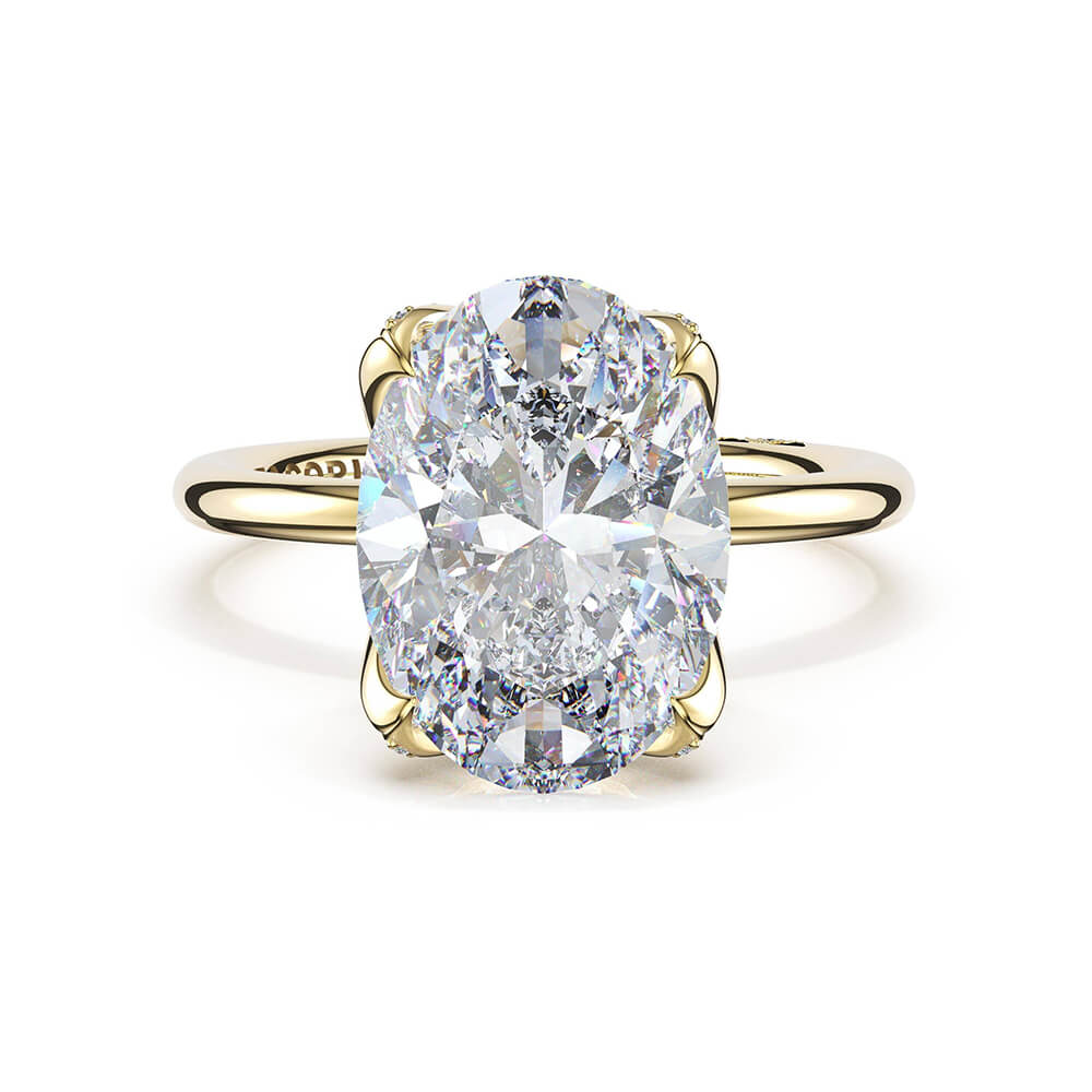 Deconstructed Dahlia petals transform into eagle claw prongs, traced in pavé diamonds as they secure a oval-cut center stone. Structure meets fluidity in sculptural balance on a high-polish 18kt yellow gold foundation.