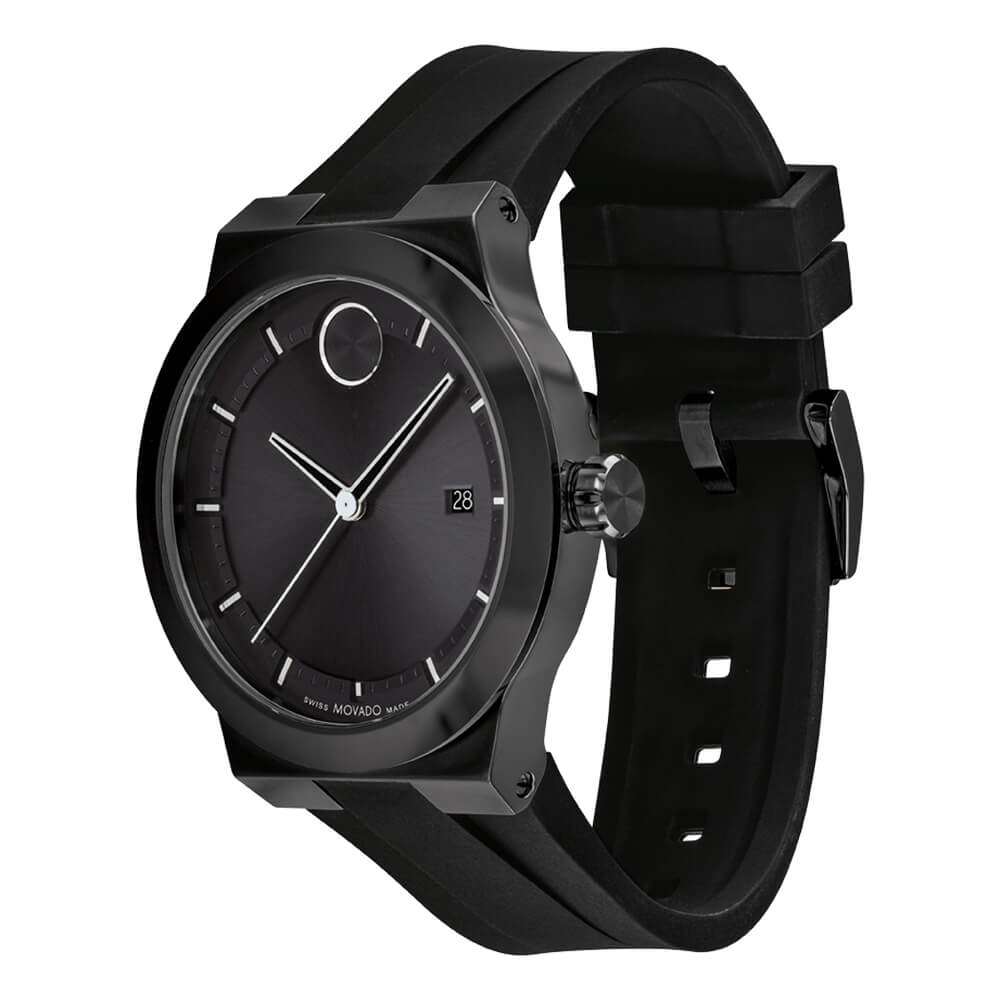 Movado BOLD Fusion, 42 mm black ion-plated stainless steel case & black ceramic bezel with a black-toned dial on black silicone strap.
