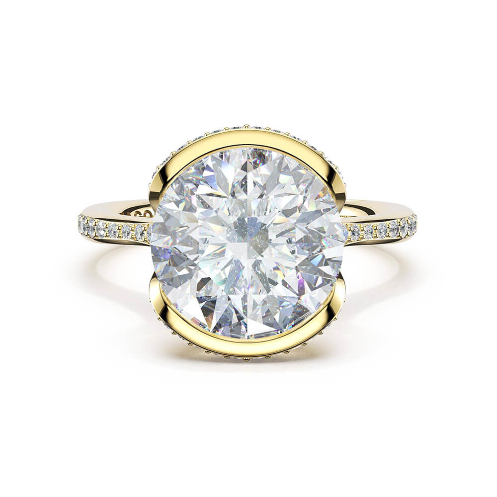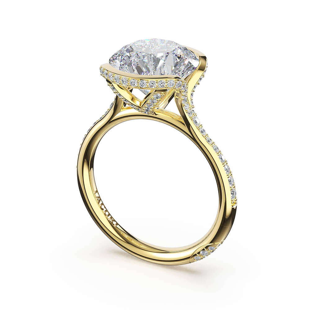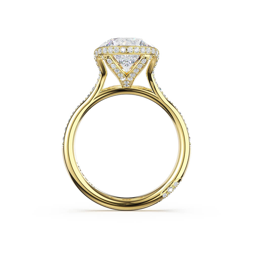 A pavé ceiling rises toward a north-south set round-cut center stone in a semi-bezel setting, while a diamond bloom adds dimension beneath. Diamond-intense and luminous, the 18kt yellow gold design creates maximum sparkle as pavé continues along the foundation in seamless light capture.