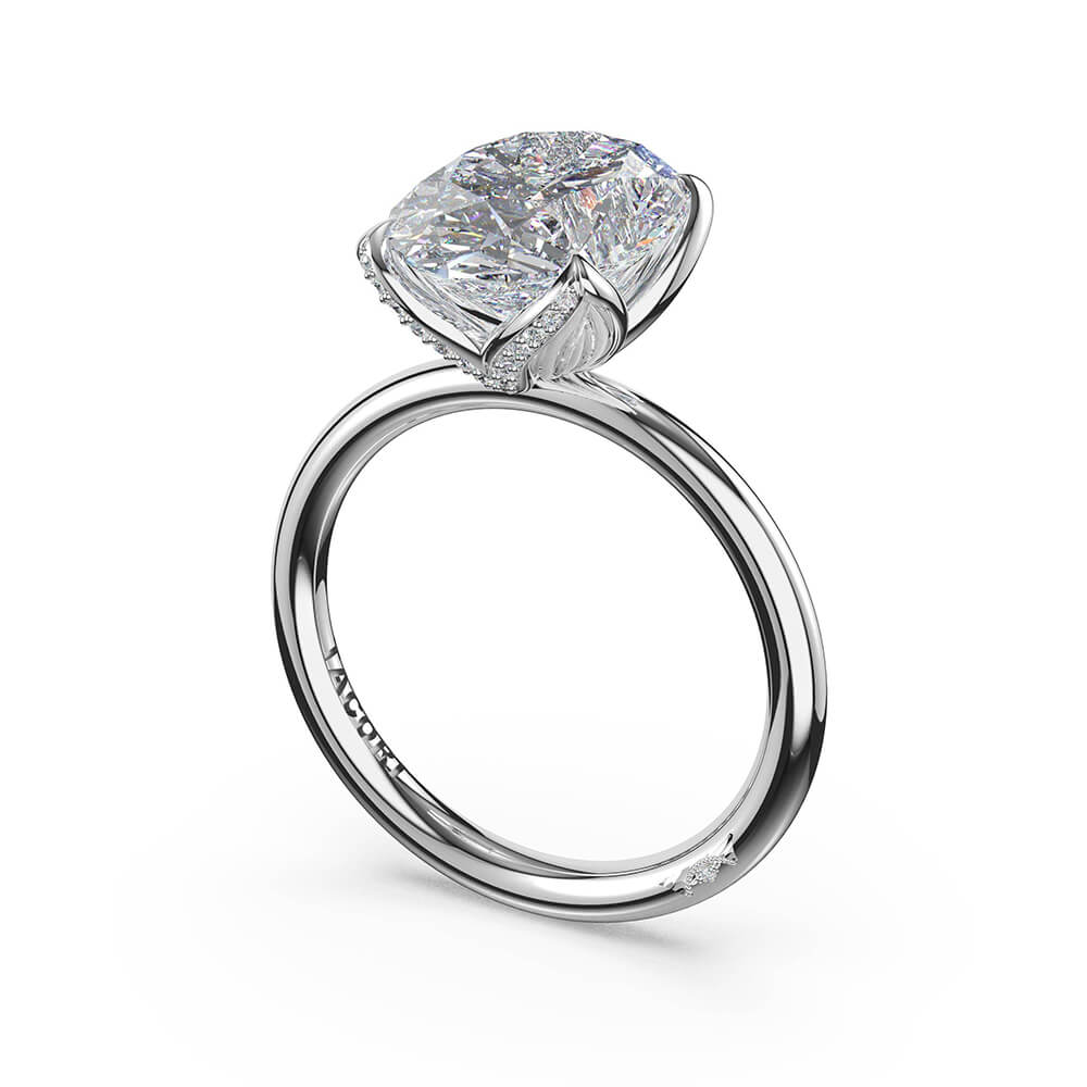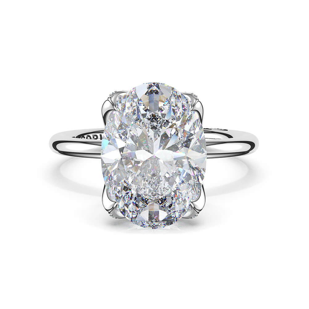Deconstructed Dahlia petals transform into eagle claw prongs, traced in pavé diamonds as they secure a oval-cut center stone. Structure meets fluidity in sculptural balance on a high-polish platinum foundation.